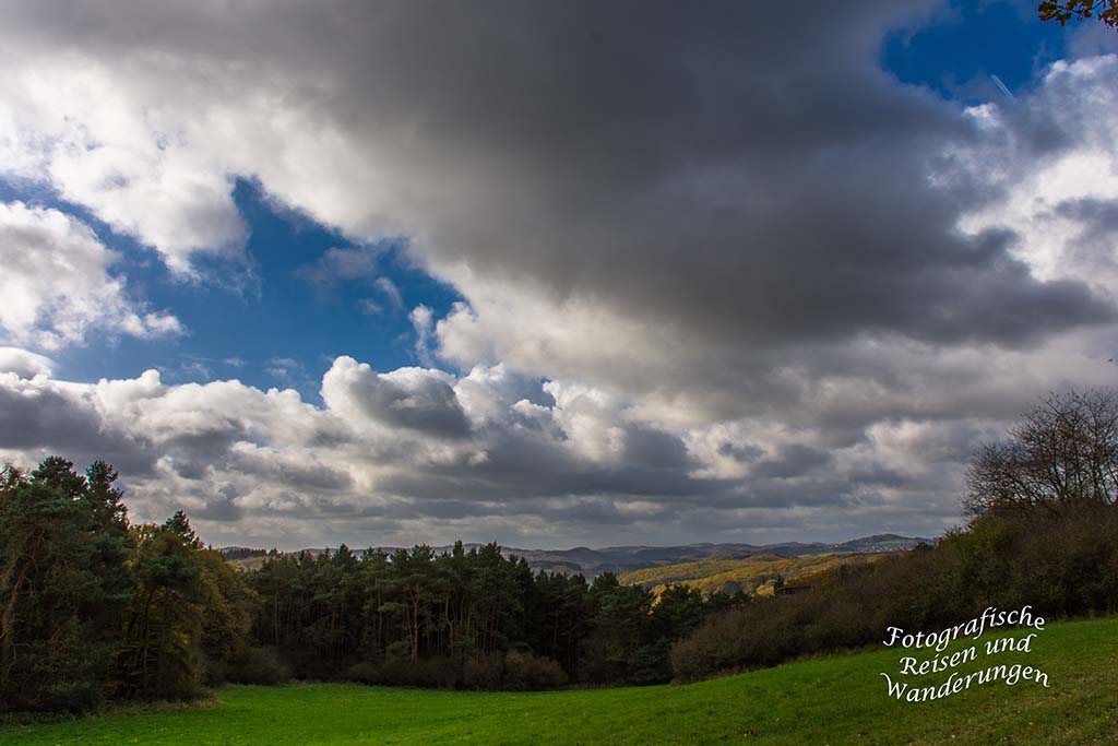 Wir treten nun endgültig aus dem Wald heraus und bleiben nun in den Weinbergen, bis wir Rech wieder erreichen. Dicke Wolken hängen tief am Himmel über uns, lassen nur gelegentlich genug Platz für das Sonnenlicht. Doch wenn sie dann scheint, und ab dieser Stunde tut sie es etwas häufiger, dann glänzt das gesamte Ahrgebirge in den herrlichsten Farbtönen.