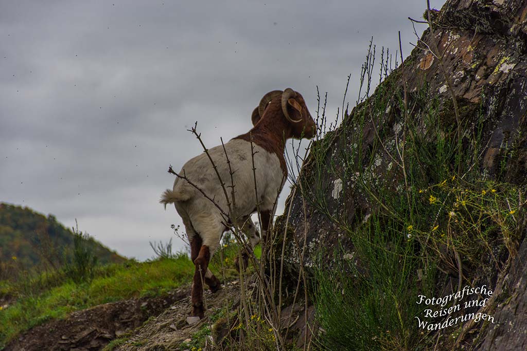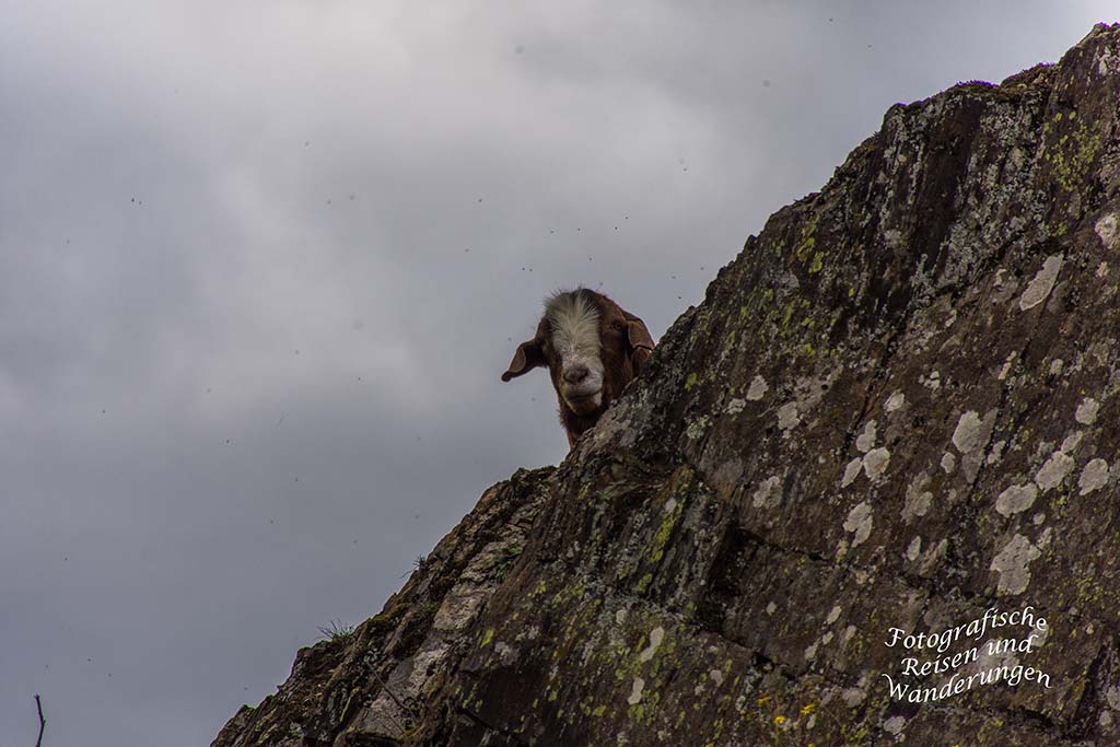 Die felsigen Hänge werden von Ziegen abgeweidet. Die lassen sich auch von den Besuchern so gar nicht stören und mümmeln ungestört weiter die Gräser und Pflanzen.